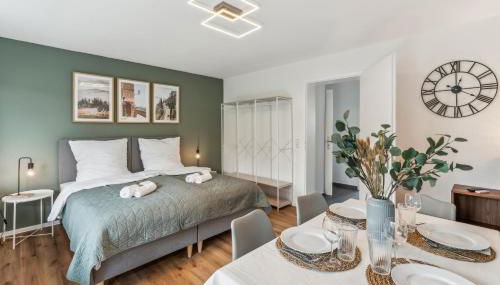 Die Unterkunft Modernes 6-Betten-Apartment mit Balkon und Parkplatz - zentrale Lage bietet ihren Gästen einen Balkon, einen Sitzbereich, einen Flachbild-TV, eine voll ausgestattete Küche mit einem Kühlschrank und einem Geschirrspüler sowie ein eigenes Badezimmer mit einer Badewanne und einem Haartrockner. Es gibt einen Ofen, eine Mikrowelle und eine Herdplatte sowie eine Kaffeemaschine und einen Wasserkocher.