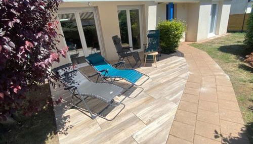 Die Unterkunft Maison charmante proches plages - 9 pers. - jardin, vélos, calme - Arzon - FR-1-639-22 verfügt über Gartenblick und Übernachtungsmöglichkeiten mit einer Terrasse und einer Kaffeemaschine, ungefähr 34 km von Hafen von Vannes entfernt.