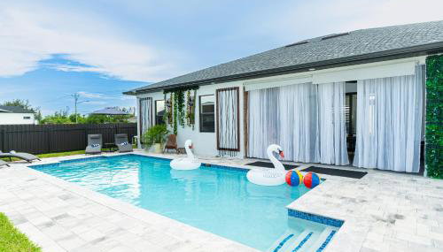 Die Unterkunft Designer Villa with Heated Pool, BBQ, Firepit, Ideal for Families & Groups, die über einen Außenpool, eine Gemeinschaftslounge und eine Terrasse verfügt, bietet Übernachtungsmöglichkeiten in Cape Coral mit kostenlosem WLAN und Stadtblick. Diese Unterkunft bietet Zugang zu einem Billardtisch, Tischtennis und einem kostenlosen Privatparkplatz.