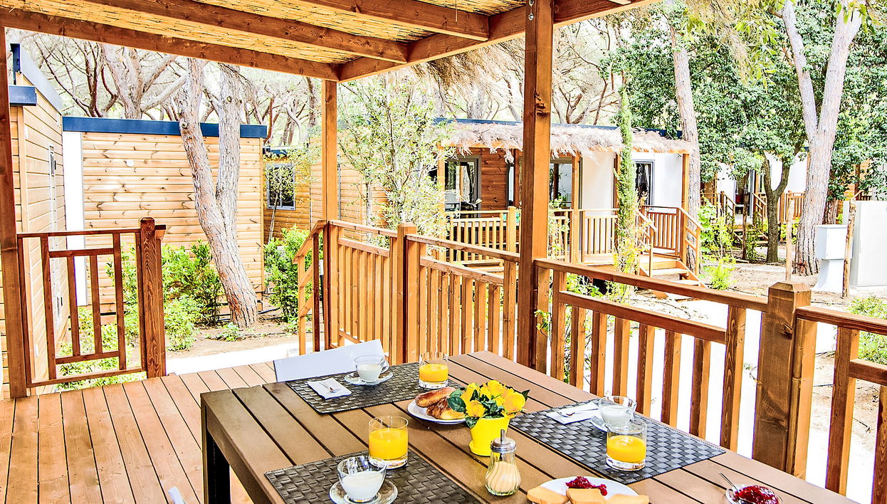 "Deluxe", 3-Zimmer-Mobilheim 45 m2, im erhöhten Erdgeschoss. Modern und geschmackvoll eingerichtet: Wohn-/Schlafzimmer mit 1 Schlafmöglichkeit (80 cm), Esstisch, TV und Klimaanlage. Ausgang zur Terrasse. 1 Zimmer mit 1 franz. Bett (170 cm). 1 Zimmer mit 2 Betten (70 cm, Länge 180 cm), 1 x 1 Etagenbetten (70 cm, Länge 180 cm). Offene Küche (4 Induktionskochplatten, Tiefkühler). Dusche/WC. E-Heizung. Terrasse überdacht. Terrassenmöbel. Zur Verfügung: Internet (Wireless LAN, gratis). Bitte beachten: Nichtraucher-Haus. IT053006B1Z27P3GUF