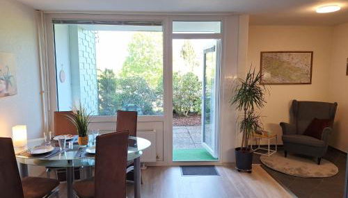 Diese Ferienwohnung mit einer Terrasse und Gartenblick bietet 1 Schlafzimmer, ein Wohnzimmer, einen Flachbild-TV, eine gut ausgestattete Küche mit einem Kühlschrank und einem Geschirrspüler sowie 1 Badezimmer mit einer Dusche. In dieser Ferienwohnung werden Handtücher und Bettwäsche angeboten.