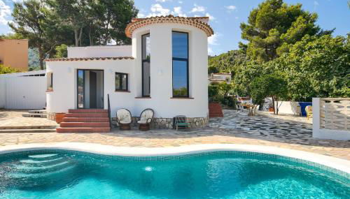 Die Unterkunft Villa for 10 with swimming pool and sea view, die über einen saisonalen Außenpool, einen Garten und eine Terrasse verfügt, bietet Übernachtungsmöglichkeiten in Denia mit kostenlosem WLAN und Meerblick.