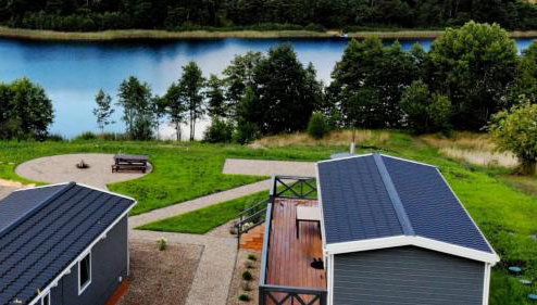 Die Unterkunft Nad Kamieniem - domki całoroczne, die über einen Garten, einen eigenen Strandbereich und eine Terrasse verfügt, bietet Übernachtungsmöglichkeiten in Dołgie mit kostenlosem WLAN und Seeblick.