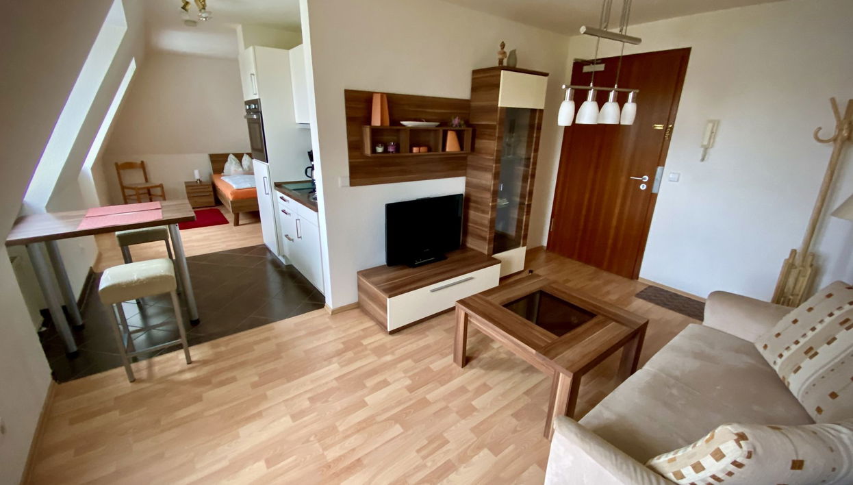 1-Zimmer-Wohnung 33 m2 im 4. Stock. Modern und gemütlich eingerichtet: Wohnzimmer mit Kabel-TV (Flachbildschirm), Stereoanlage. 1 offenes Zimmer mit 1 Doppelbett (180 cm, Länge 200 cm). Kochnische (Backofen, 4 Glaskeramikplatten, Toaster, Wasserkocher, elektrische Kaffeemaschine) mit kleinem Esstisch. Dusche/WC. Heizung. Zur Verfügung: Haartrockner. Garage (1 Auto). Bitte beachten: Nichtraucher-Unterkunft. Rauchmelder. Aufbettung 3. und 4. Person (Doppelbettcouch) gegen Bezahlung möglich.