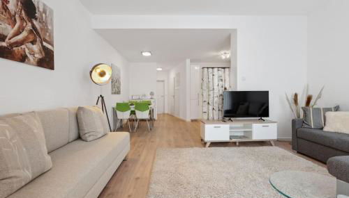 Diese Ferienwohnung mit einer Terrasse und Gartenblick bietet 1 Schlafzimmer, ein Wohnzimmer, einen Flachbild-TV, eine gut ausgestattete Küche mit einem Kühlschrank und einem Geschirrspüler sowie 1 Badezimmer mit einer Dusche. In dieser Ferienwohnung werden Handtücher und Bettwäsche angeboten.