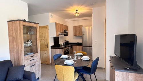Diese Ferienwohnung mit einer Terrasse und Bergblick bietet 2 Schlafzimmer, ein Wohnzimmer, einen Flachbild-TV, eine gut ausgestattete Küchenzeile mit einem Kühlschrank und einem Geschirrspüler sowie 1 Badezimmer mit einer Dusche.