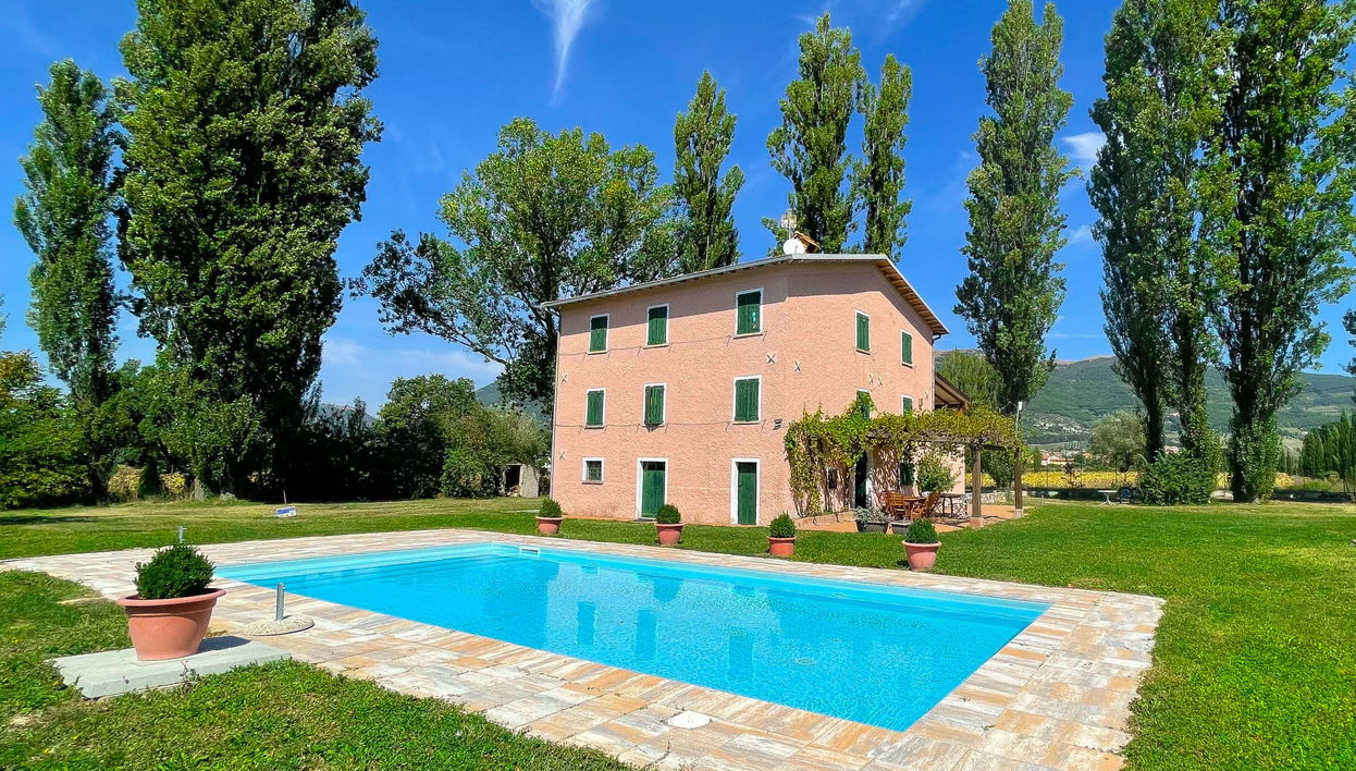 Freistehender Landsitz "L'acero", umgeben von Feldern. 5 km vom Zentrum von Gubbio. Zur Alleinbenutzung: Grundstück 2'000 m2 (eingezäunt), Schwimmbad (5 x 10 m, 140 cm tief, saisonale Verfügbarkeit: 01.Jun. - 30.Sep.). Aussendusche, Sitzplatz (40 m2), Grill. Zufahrt (300 m Naturweg). Parkplatz auf dem Grundstück. Lebensmittelgeschäft 5 km, Supermarkt 5 km, Bahnstation 5 km. Bitte beachten: Fahrzeug empfohlen.