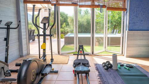 Dieses Ferienhaus mit Klimaanlage besteht aus 4 Schlafzimmern, einem Wohnzimmer, einer voll ausgestatteten Küche mit einem Kühlschrank und einer Kaffeemaschine sowie 3 Badezimmern mit einem Bidet und einer Dusche. In diesem Ferienhaus werden Handtücher und Bettwäsche angeboten.