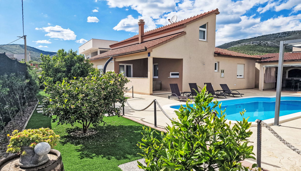 Einfamilienhaus "Luka", auf 2 Stockwerken. Im Weiler Plano, 7 km vom Zentrum von Trogir, 5 km vom Meer. Zur Alleinbenutzung: Grundstück 800 m2 (eingezäunt) mit Pflanzen, Schwimmbad eckig, beheizt (10 x 3 m, 150 cm tief, saisonale Verfügbarkeit: 01.Mai. - 01.Okt.) mit Innentreppe. Aussendusche, Sprudelbad, Poolhaus mit Kühlschrank und Kochherd, Terrasse (50 m2). Im Hause: Internetzugang, Fitnessraum, Tischfussball, Trampolin, Waschmaschine. Parkplatz (für 3 Autos) beim Haus auf dem Grundstück. Einkaufsgeschäft 900 m, Supermarkt 3 km, Restaurant 3 km, Bushaltestelle 350 m, Kieselstrand 5 km. Bitte beachten: Flugplatz 5 km vom Haus.