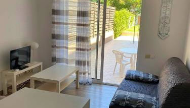 Diese Ferienwohnung ist versehen mit einem Wohnzimmer und einer voll ausgestatteten Küchenzeile mit einem Kühlschrank und einer Mikrowelle.