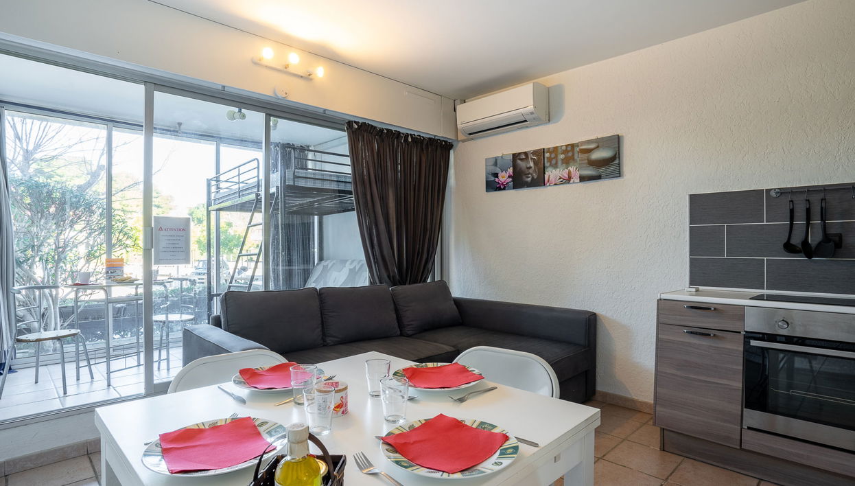 1-Zimmer-Studio 28 m2, im Erdgeschoss. Wohn-/Esszimmer mit 2 Doppeldiwanbetten (140 cm, Länge 190 cm), Klimaanlage. Kochnische (Backofen, 3 Glaskeramikplatten, Toaster, Wasserkocher, Mikrowelle, elektrische Kaffeemaschine). Bad, Dusche/WC. Loggia. Zur Verfügung: Waschmaschine. Internet (WLAN, gratis). Parkplatz Nr. EN COMMUN. Bitte beachten: Wohnung auf Parkplatzseite. Maximal 1 Haustier/Hund erlaubt. Rauchmelder.