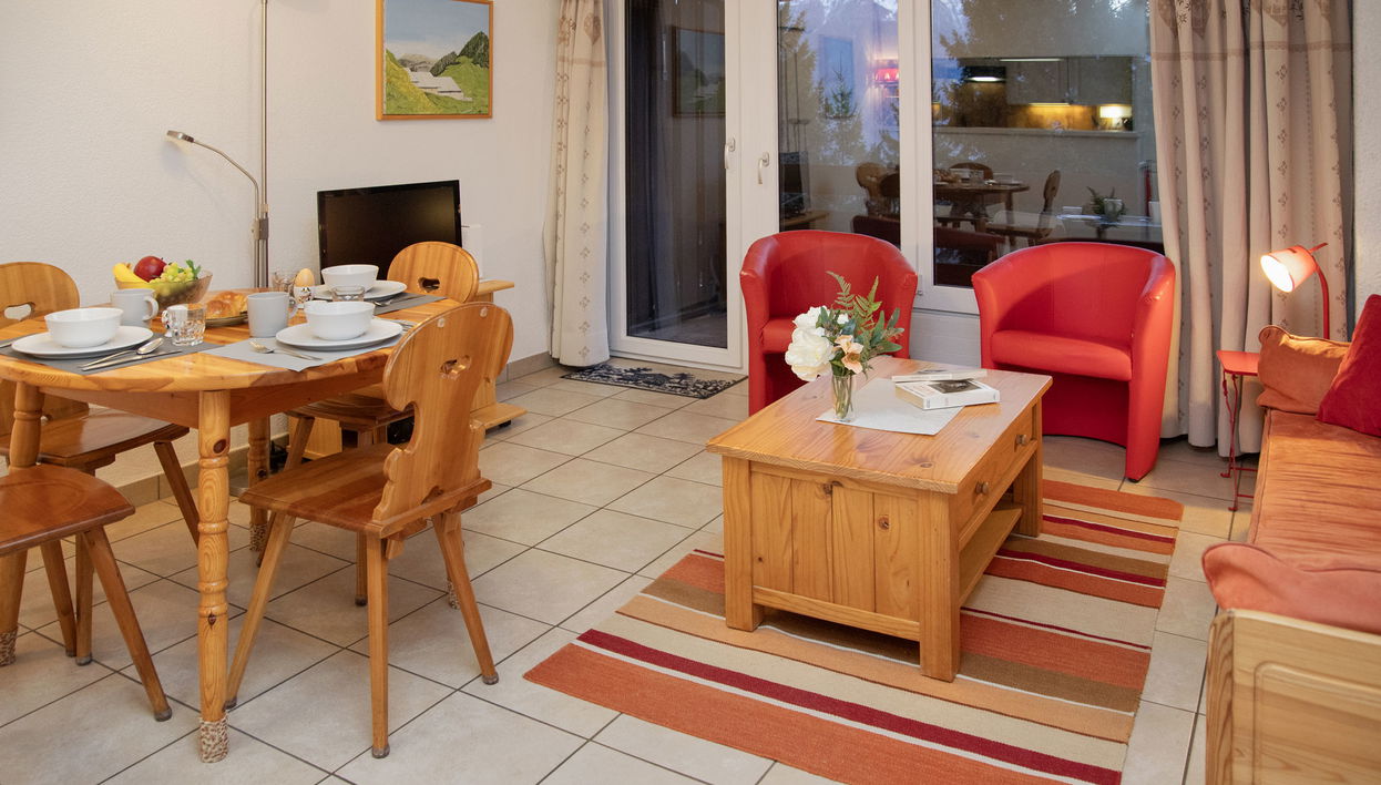 "Centaure B RS 2", 2-Zimmer-Wohnung 48 m2, im Obergeschoss, Südlage. Komfortabel und schön eingerichtet: Wohn-/Esszimmer mit 1 Doppeldiwanbett (2 x 72 cm, Länge 190 cm), Kabel-TV, Flachbildschirm, Radio, CD und DVD.