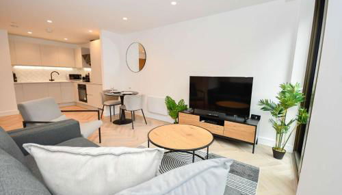 Die Unterkunft Modern 1 Bed Flat in Central Manchester w Balcony ist ausgestattet mit 1 Schlafzimmer, einer Küche mit einem Kühlschrank und einem Geschirrspüler, einer Waschmaschine und 1 Badezimmer mit kostenlosen Pflegeprodukten und einem Haartrockner. In dieser Ferienwohnung werden Handtücher und Bettwäsche zur Verfügung gestellt.