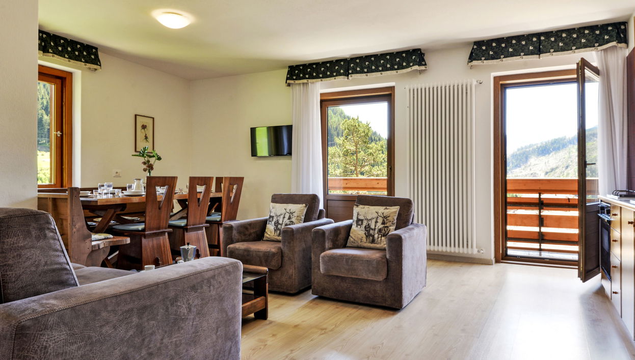 Mehrfamilienhaus "El Ladinia", 1'255 m.ü.M., auf 4 Stockwerken. 2 Häuser im Ferienresort. 6 Wohnungen in der Residenz. Im Ortsteil Someda, 3 km vom Zentrum von Moena, 7 km vom Zentrum von Pozza di Fassa, 70 km vom Zentrum von Bolzano, sonnige, erhöhte Lage am Hang, in einem Wohnquartier, Richtung Süden. Zur Mitbenutzung: Grundstück (eingezäunt), terrassierter Garten mit Rasen und Bäumen, Naturgarten. Laube, Gartenmöbel, Grill, Kinderspielplatz (Rutschbahn, Schaukel). Im Hause: Aufenthaltsraum, Wireless LAN, Wellnessbereich in 50 m (extra), Skiraum, Waschmaschine (zur Mitbenutzung), Heizung nur verfügbar von 20.Sep. - 30.Apr.. Frühstück auf Anfrage (extra). Parkplatz beim Haus auf dem Grundstück. Lebensmittelgeschäft 2.5 km, Supermarkt 5 km, Zentrum zu Fuss in 10 Minuten erreichbar, Bushaltestelle "Moena" 3 km, Hallenbad 7.7 km. Golfplatz (9 Loch) 16 km, Skisportanlagen 2 km, Skibushaltestelle 100 m. Nahe gelegene Sehenswürdigkeiten: Canazei (Sella Ronda) 17 km, Skiarea San Pellegrino 14 km. Bekannte Skigebiete sind gut erreichbar: Moena/Alpe Lusia 2 km, Pozza di Fassa/Buffaure (Sella Ronda) 8.2 km, Predazzo/Latemar 11 km. Bitte beachten: Der Besitzer wohnt im selben Haus. Der SPA Bereich befindet sich im benachbarten Hotel. ( Bezahlung vor Ort).