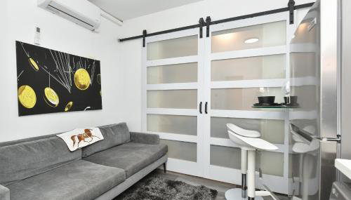 Diese Ferienwohnung mit Klimaanlage ist eingerichtet mit 1 Schlafzimmer, Flachbild-TV, einem Essbereich und einer Küche mit einem Kühlschrank und einem Geschirrspüler. In dieser Ferienwohnung werden Handtücher und Bettwäsche angeboten.