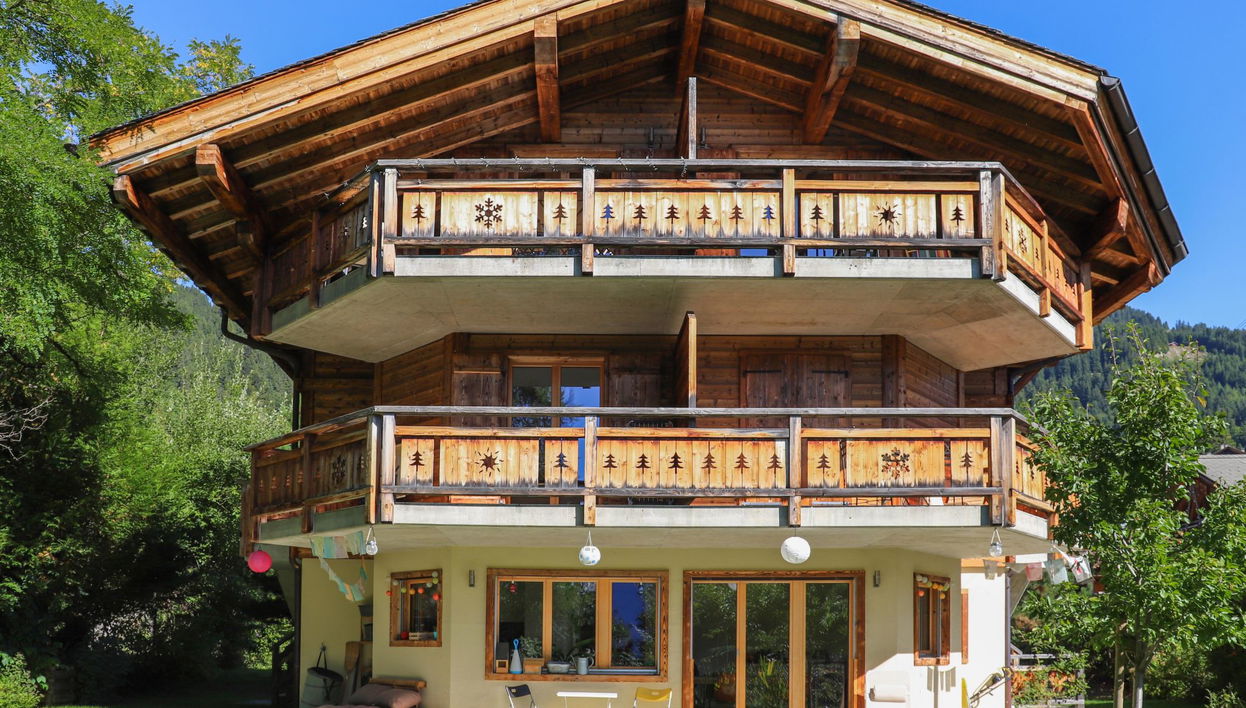 "Chalet Sans Soucis", 4-Zimmer-Wohnung 74 m2 auf 2 Stockwerken im 1. Stock, Südlage. Renoviert im Jahre 2020, komfortabel und geschmackvoll eingerichtet: 1 Zimmer mit 1 franz. Bett (1 x 160 cm). Ausgang zum Balkon, Richtung Süden. 1 Zimmer mit 2 Betten (90 cm). Bad/WC, Whirlbadewanne. Obergeschoss: kleines Wohn-/Esszimmer mit Esstisch. Ausgang zum Balkon, Richtung Süden. 1 Zimmer, ohne Schrank mit 1 Doppelbett (2 x 90 cm), Dusche/WC. Offene Küche (Backofen, Geschirrspüler, 4 Glaskeramikplatten, Tiefkühler, elektrische Kaffeemaschine, Kapseln für die Kaffeemaschine (Nespresso) extra). 2 kleine Balkone 10 m2, Südlage. Balkonmöbel, Gartengrill. Eingeschränkte Sicht auf die Berge. Zur Verfügung: Waschmaschine, Wäschetrockner. Internet (Wireless LAN, gratis). Parkplatz Nr. 10 et 11 (eingezäunt, 2 Autos). Bitte beachten: Nichtraucher-Unterkunft. Kein Fahrstuhl.