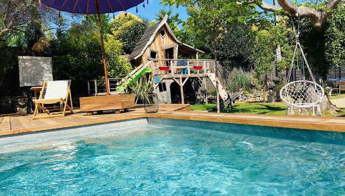 Die Unterkunft Villa Exotica et belle cabane en bois idéal famille bietet einen Kinderspielplatz.