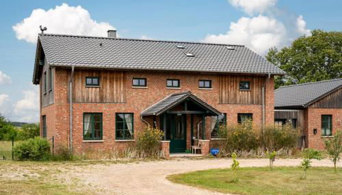 Die Unterkunft Ferienhaus Landurlaub mit Kamin, die über eine Terrasse verfügt, bietet Übernachtungsmöglichkeiten in Schwarz mit kostenlosem WLAN und Gartenblick.