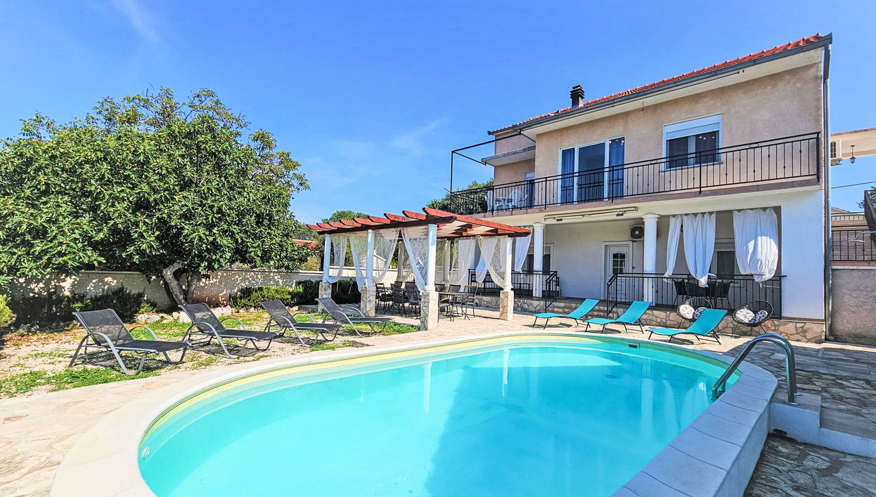 Dubrava: Schönes Einfamilienhaus "Joy on Countryside", auf 2 Stockwerken. 8 km vom Zentrum von Šibenik, ruhige, sonnige Lage, 8 km vom Meer. Zur Alleinbenutzung: Grundstück 1'000 m2, Pflanzen und Bäumen, Schwimmbad eckig (7 x 3 m, 26 m2, 150 cm tief, saisonale Verfügbarkeit: 01.Jun. - 10.Sep.). Aussendusche, Terrasse (10 m2), Gartenmöbel, Grill. Im Hause: Internetzugang, Trampolin, Waschmaschine. Parkplatz (für 6 Autos) beim Haus auf dem Grundstück. Einkaufsgeschäft 2.5 km, Restaurant 8 km, Bushaltestelle 850 m, Kieselstrand 10 km. Reitstall 1 km. Nahe gelegene Sehenswürdigkeiten: NP Krka 12 km. Bitte beachten: geeignet für Familien. Jugendgruppen nur auf Anfrage. Flugplatz 45 km vom Haus. Das Haus besteht aus 3 Ferienwohnungen, die als ein Objekt vermietet werden. Zwei Ferienwohnungen sind im Erdgeschoss und eine Ferienwohnung ist im erstem Stock.