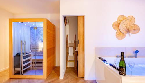 Die Unterkunft Suite Bali de 45m2 - Idéal couple - Chambre séparée - Jacuzzi baignoire balnéo - Sauna - Clim réversible - Netflix - Piscine accès partagé avec la petite copro - Bouteille de champagne offerte dès 2 nuits verfügt über eine Reihe von Einrichtungen wie eine Sauna mit einem Whirlpool.