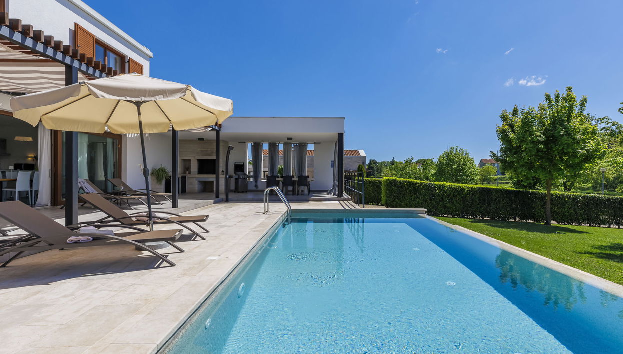 Moderne Villa "Terra Grigia", auf 2 Stockwerken. 4 km vom Zentrum von Žminj, 13 km vom Zentrum von Pazin, ruhige, sonnige Lage, 27 km vom Meer. Zur Alleinbenutzung: Grundstück 500 m2, schöner, gepflegter Garten, Schwimmbad eckig (8 x 4 m, 140 cm tief, saisonale Verfügbarkeit: 01.Jan. - 31.Dez.) mit Innentreppe. Aussendusche, Terrasse (21 m2), Gartenmöbel, Grill. Im Hause: Internetzugang, Waschmaschine, Wäschetrockner. Parkplatz (für 2 Autos, überdacht) beim Haus auf dem Grundstück. Einkaufsgeschäft 100 m, Supermarkt 6 km, Restaurant 1 km, Café 500 m, Bushaltestelle 7 km, Bahnstation 500 m, Kieselstrand 27 km. Reitstall 2 km, Wanderwege ab Haus 1 km, Radweg 1 km. Jugendgruppen nur auf Anfrage. Massage 500 m.