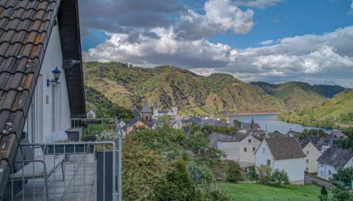 Spacious Accommodation: Ferienwohnung Panorama Moselblick in Treis-Karden offers a spacious apartment with two bedrooms and a living room. Guests enjoy a balcony with scenic views of the Mosel River, vineyards, and mountains.