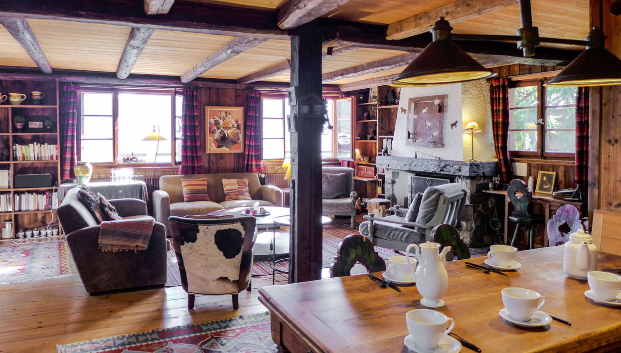 "Filaos", 6-Zimmer-Chalet 160 m2 auf 3 Stockwerken. Teilweise renoviert im Jahre 2015, komfortabel und gemütlich eingerichtet: grosses Wohn-/Esszimmer mit Kabel-TV. Ausgang zur Terrasse.