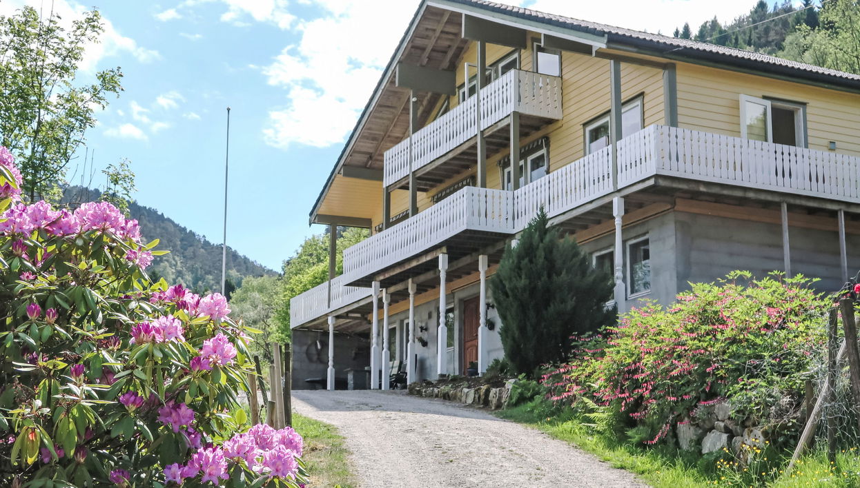 "Gule huset", 7-Zimmer-Haus 275 m2 auf 3 Stockwerken. Teilweise renoviert im Jahre 2004, gemütlich eingerichtet: Wohn-/Esszimmer mit offenem Kamin, Esstisch, Kabel-TV und DVD. 1 Doppelzimmer. Küche (4 Kochplatten, Backofen, Geschirrspüler, Toaster, Wasserkocher, Tiefkühler, elektrische Kaffeemaschine) mit Esstisch. Ausgang zum Balkon. Bad/WC. Unteres Geschoss: 1 Doppelzimmer. 1 Zimmer mit 1 x 3 Etagenbetten. Dusche/WC, sep. WC. Obergeschoss: Wohnzimmer mit Sat-TV und DVD. Ausgang zum Balkon. 1 Doppelzimmer. 1 Zimmer mit 2 Betten. E-Heizung. Balkon, grosse Terrasse. Terrassenmöbel, Balkonmöbel, Gartengrill (mobil), Abstellkammer. Schöne Panoramasicht. Zur Verfügung: Waschmaschine, Wäschetrockner, Babybett. Internet (Wireless LAN, extra). Bitte beachten: Nichtraucher-Haus. Rauchmelder, Feuerlöscher. Gefriertruhe ca. 300 l. 924531169