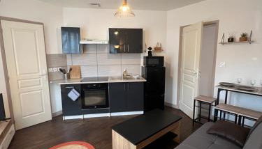 Diese Ferienwohnung bietet eine Terrasse, 1 Schlafzimmer, ein Wohnzimmer und eine gut ausgestattete Küche.